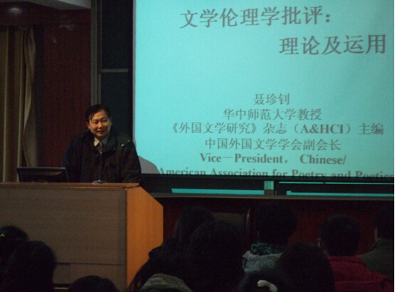 在随后的讲座中,聂珍钊教授首先介绍了文学伦理学批评的发展现状,并通过介绍相关的国际学术期刊及国际出版社对来自中国的文学伦理学批评理论的绍介展示了该理论在国际上的重大影响力。其次,聂珍钊教授对文学伦理学批评的基本观点进行了逐一介绍,包括:文学伦理表达论﹑文学文本论﹑文学物质论及文学教诲论等。再次,聂珍钊教授分别以《哈姆雷特》和《西游记》举例讲解了文学伦理学中的关键概念:伦理身份及伦理禁忌。最后,聂珍钊教授热情细致地回答了在场师生提出的关于伦理对错判断及伦理选择与幸福感的问题,并提出了“政治与伦理”﹑“科学与伦理”的新观点。整场会议在热烈的掌声中落下了帷幕。